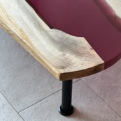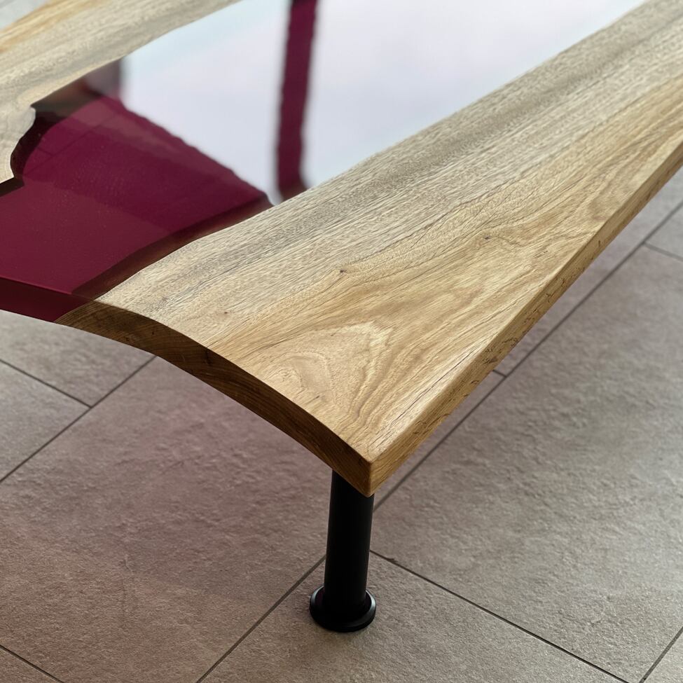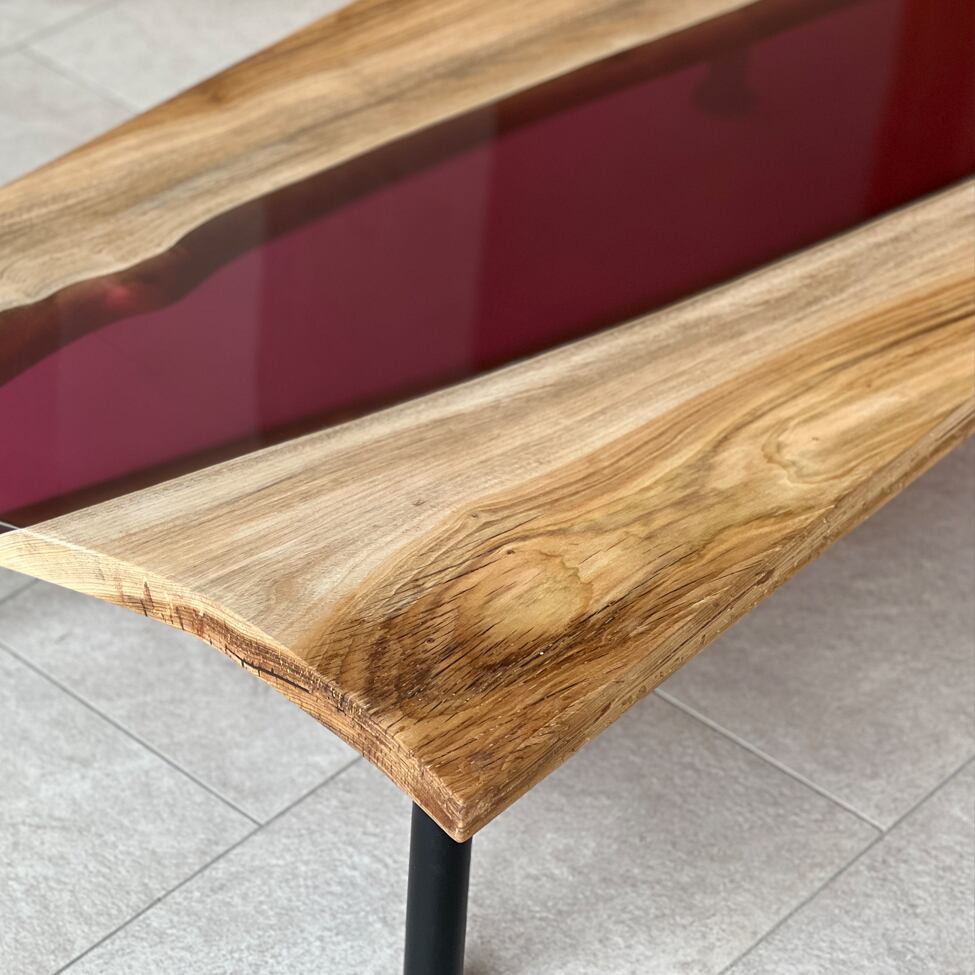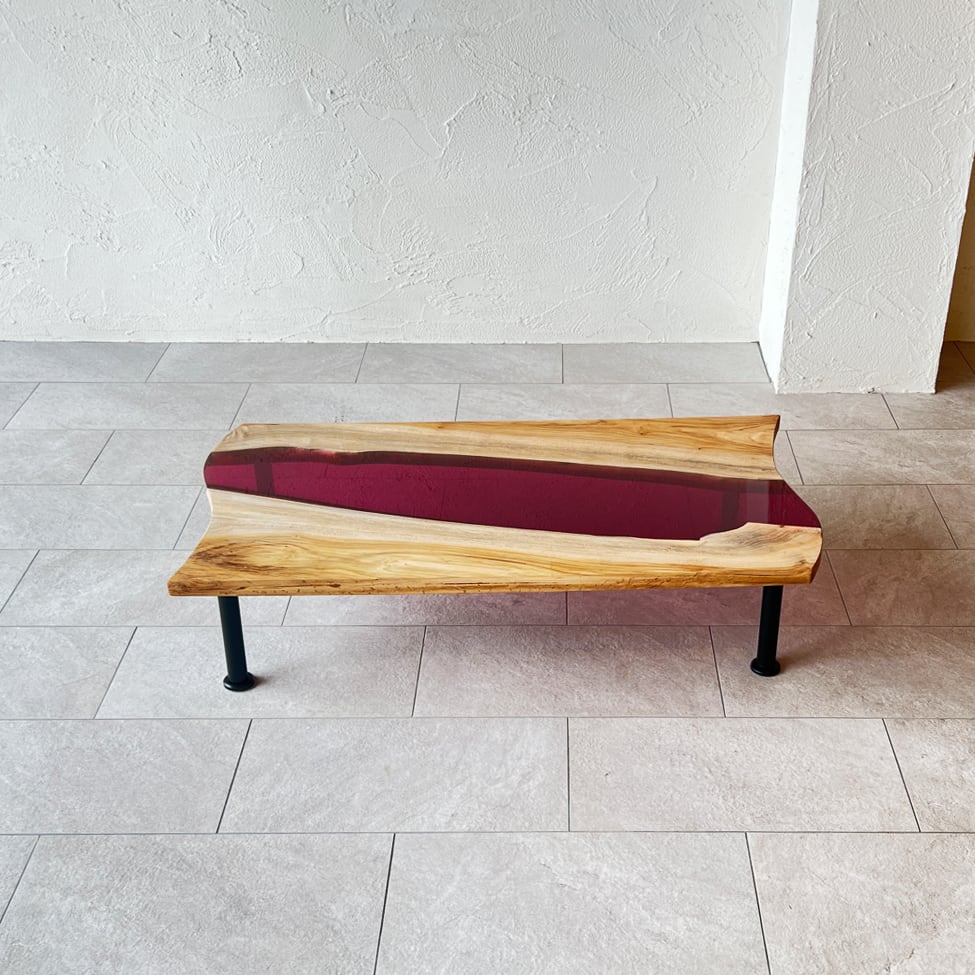 天板中央には、深みのあるダークレッドのレジンを流し込み、丁寧に磨き上げることで透明感のある仕上がりに。