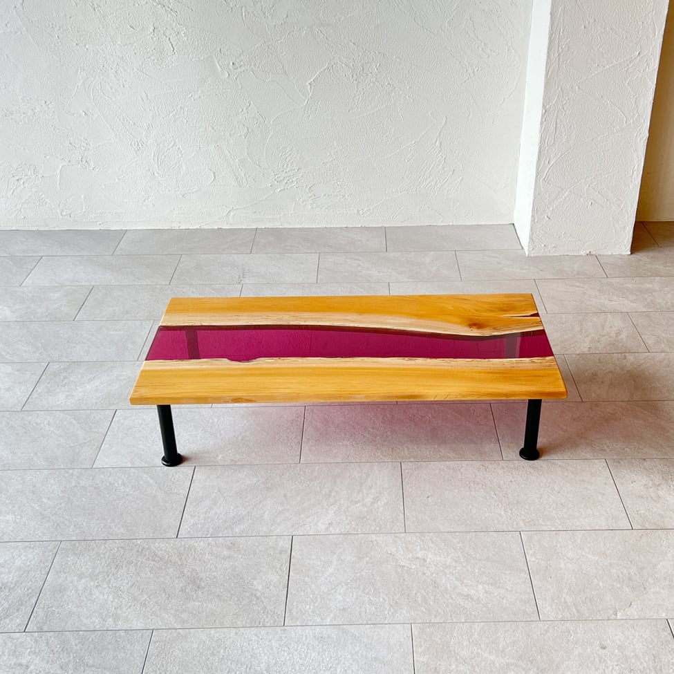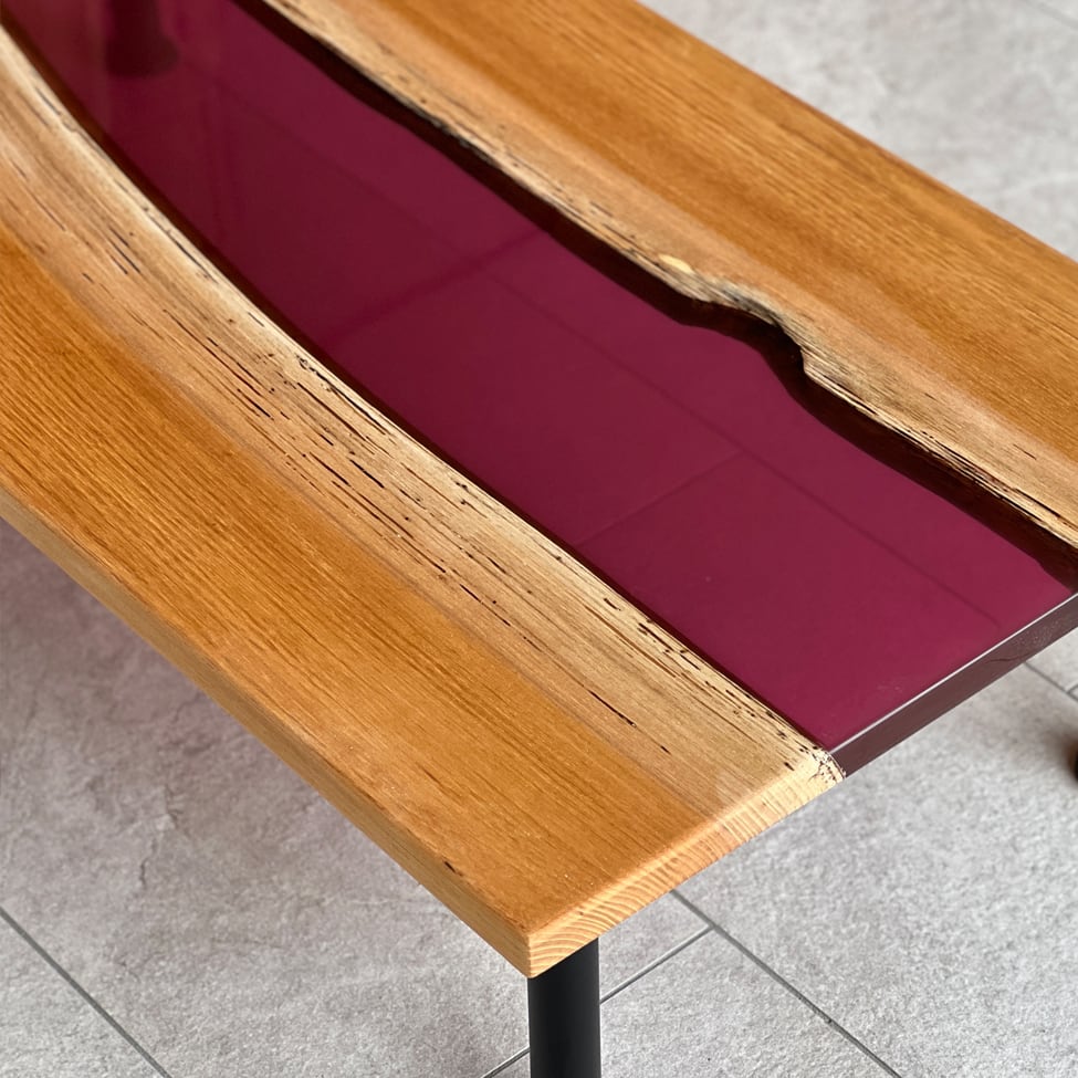 天板中央には、深みのあるダークレッドのレジンを流し込み、丁寧に磨き上げることで透明感のある仕上がりに。