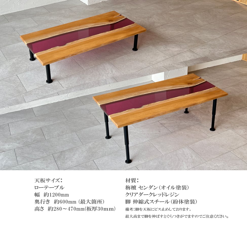 【一点もの】センダン 栴檀 レジンテーブル ローテーブル 一枚板テーブル 座卓 おしゃれ 希少木材 天然木 1200mm×600mm×280mm~470mm 30mm RC691ST070