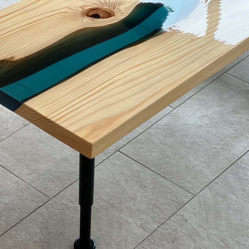 天板中央には、深みのあるダークブルーのレジンを流し込み、鏡面仕上げのウレタン塗装によって艶やかに磨き上げています。