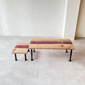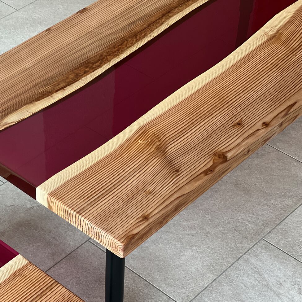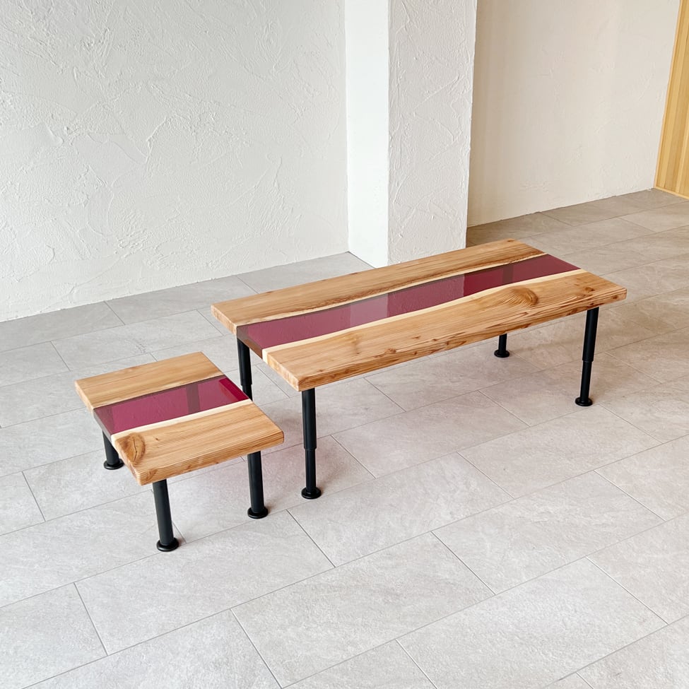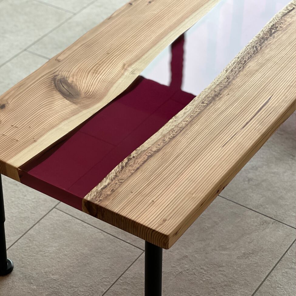 天板中央には、深みのあるダークレッドのレジンを流し込み、丁寧に磨き上げることで透明感のある仕上がりに。