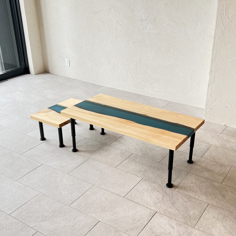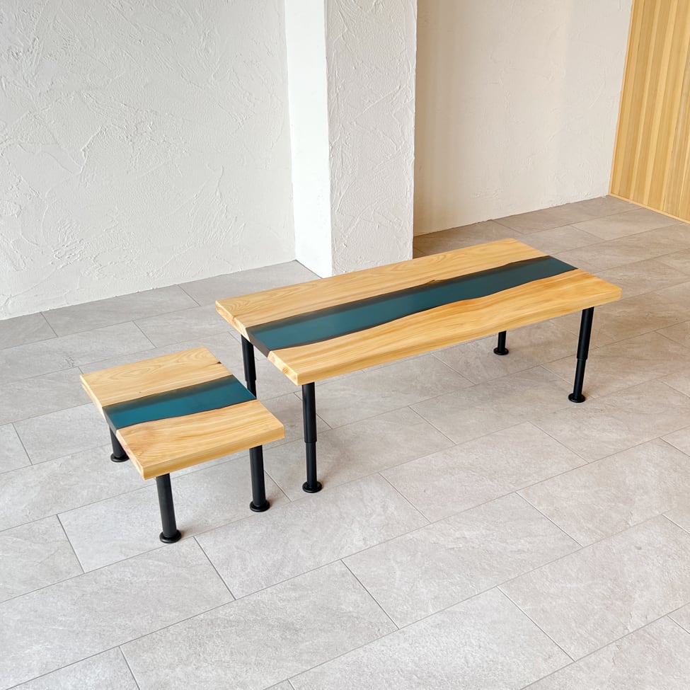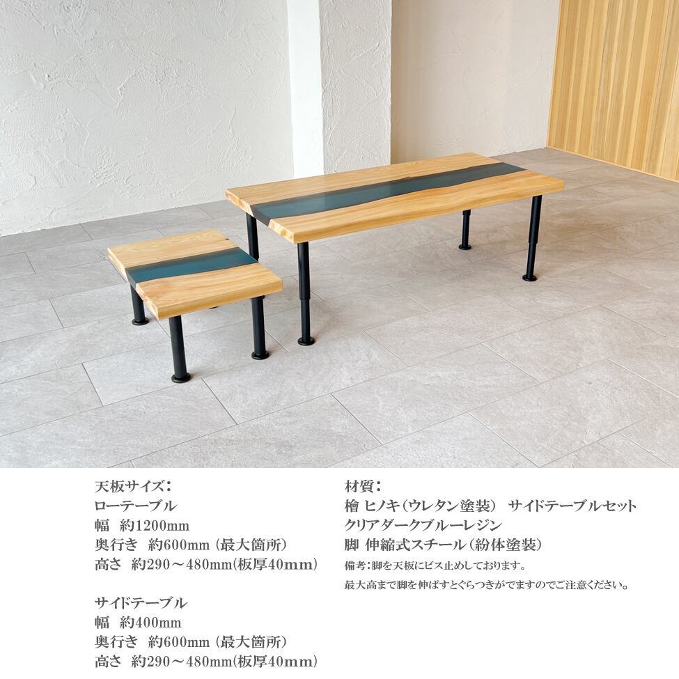 【一点もの】檜 ヒノキ レジンテーブル ローテーブル サイドテーブルセット 一枚板テーブル 座卓 おしゃれ 希少木材 天然木 1200mm×600mm×290mm~480mm 40mm RC691ST075