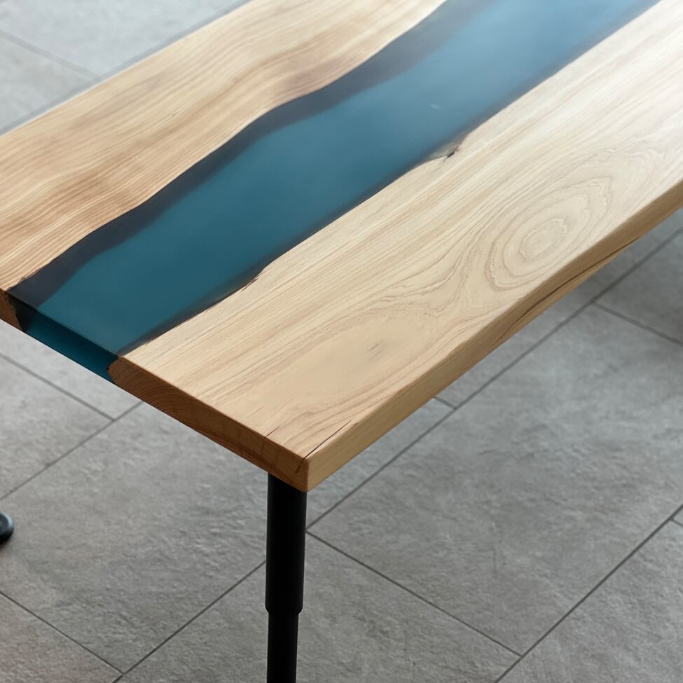 天板中央には、深みのあるダークレジンを流し込み、艶を抑えたウレタン塗装で仕上げています。