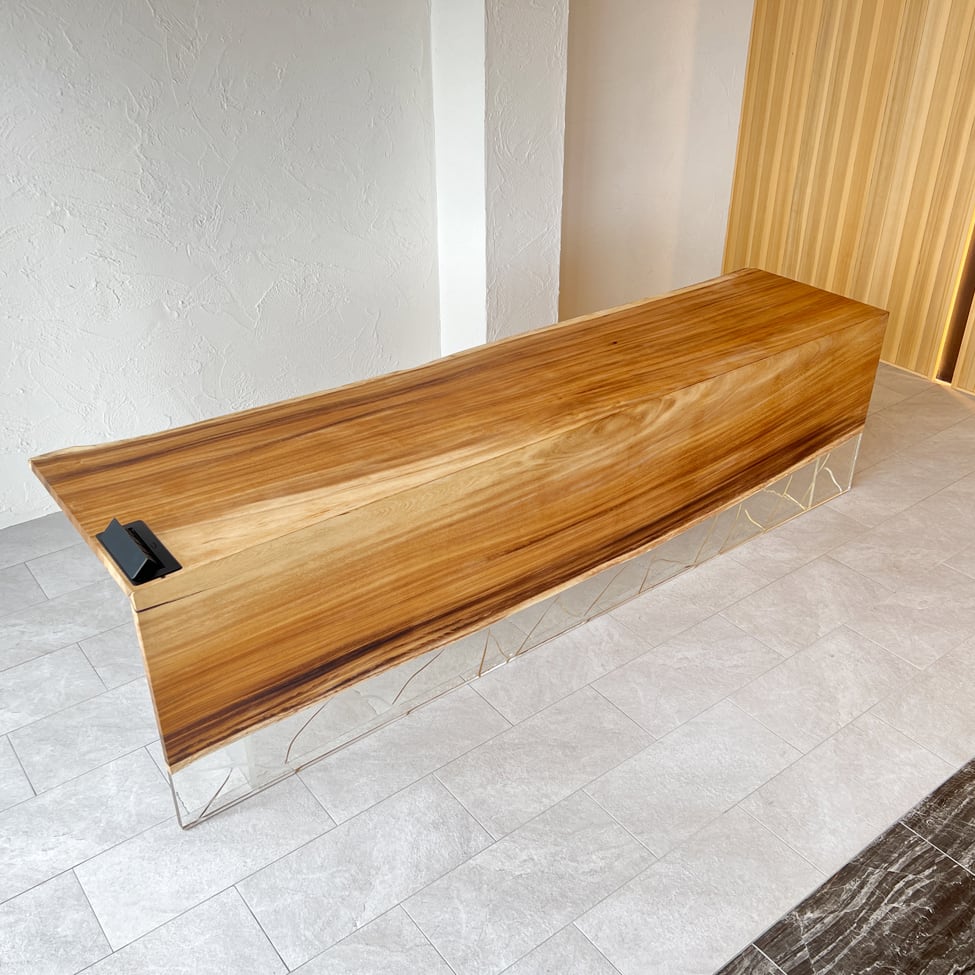 選び抜かれたモンキーポッドの大判一枚板を贅沢に使用した、重厚かつ洗練されたカウンターデスクです。