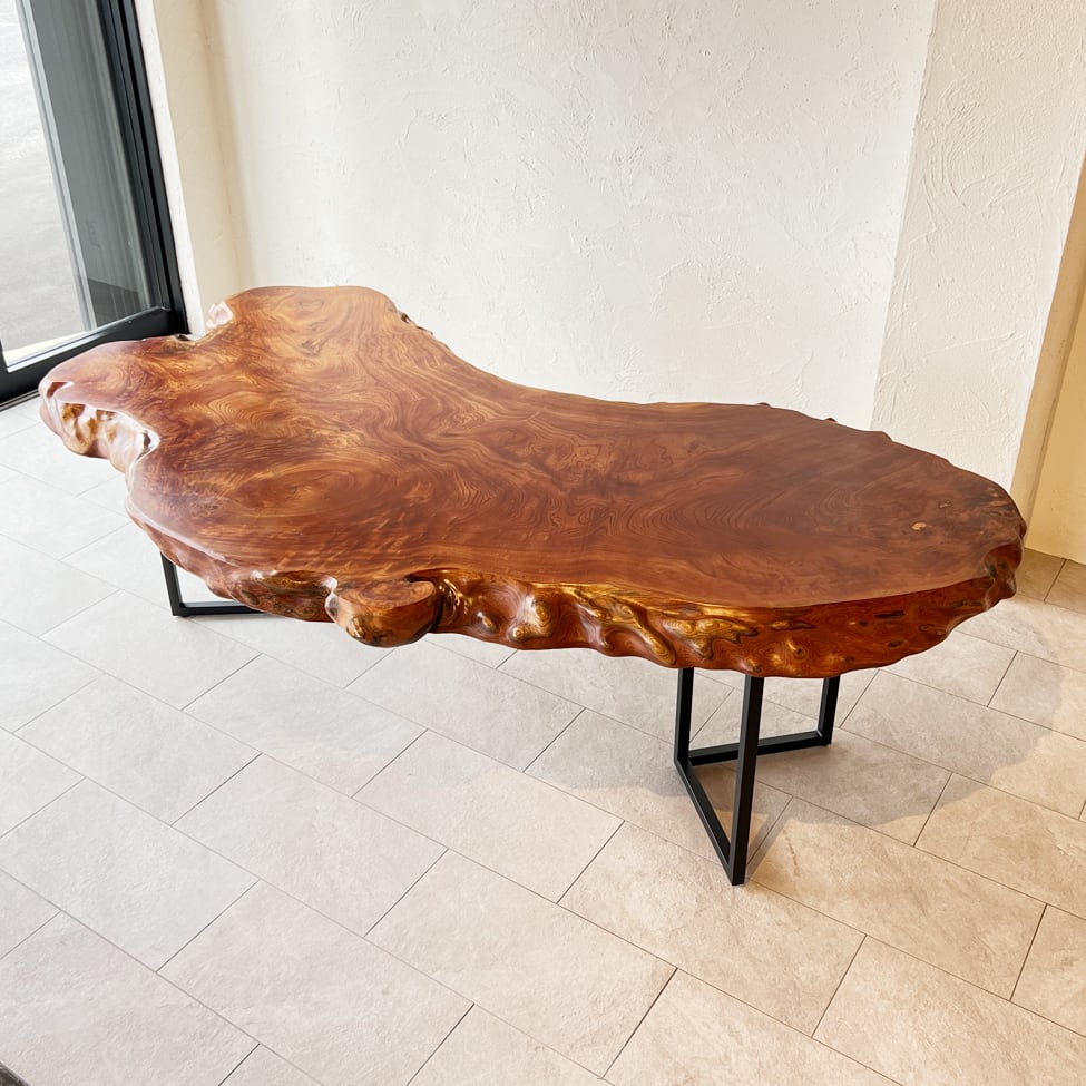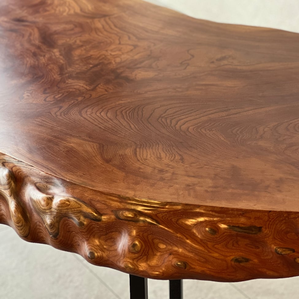これらの杢目が一枚の板の中に複合的に現れることで、木材としての価値はもちろん、空間に置いた際の芸術的存在感が格段に高まります。