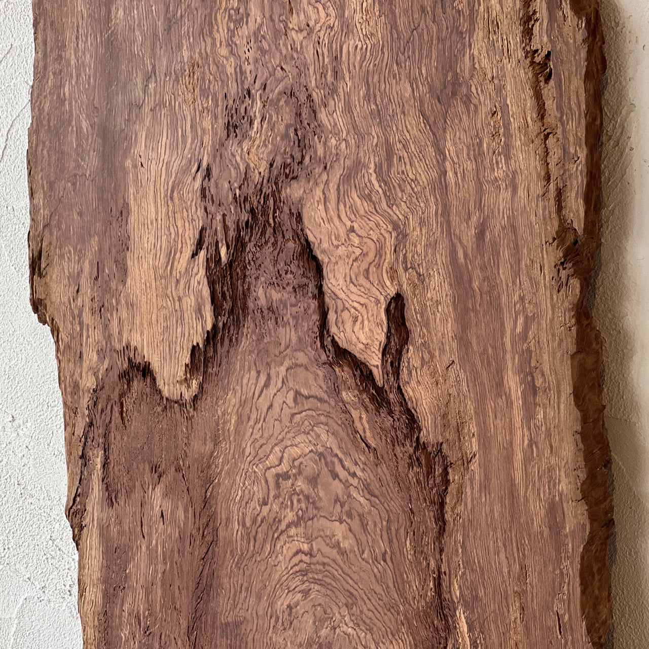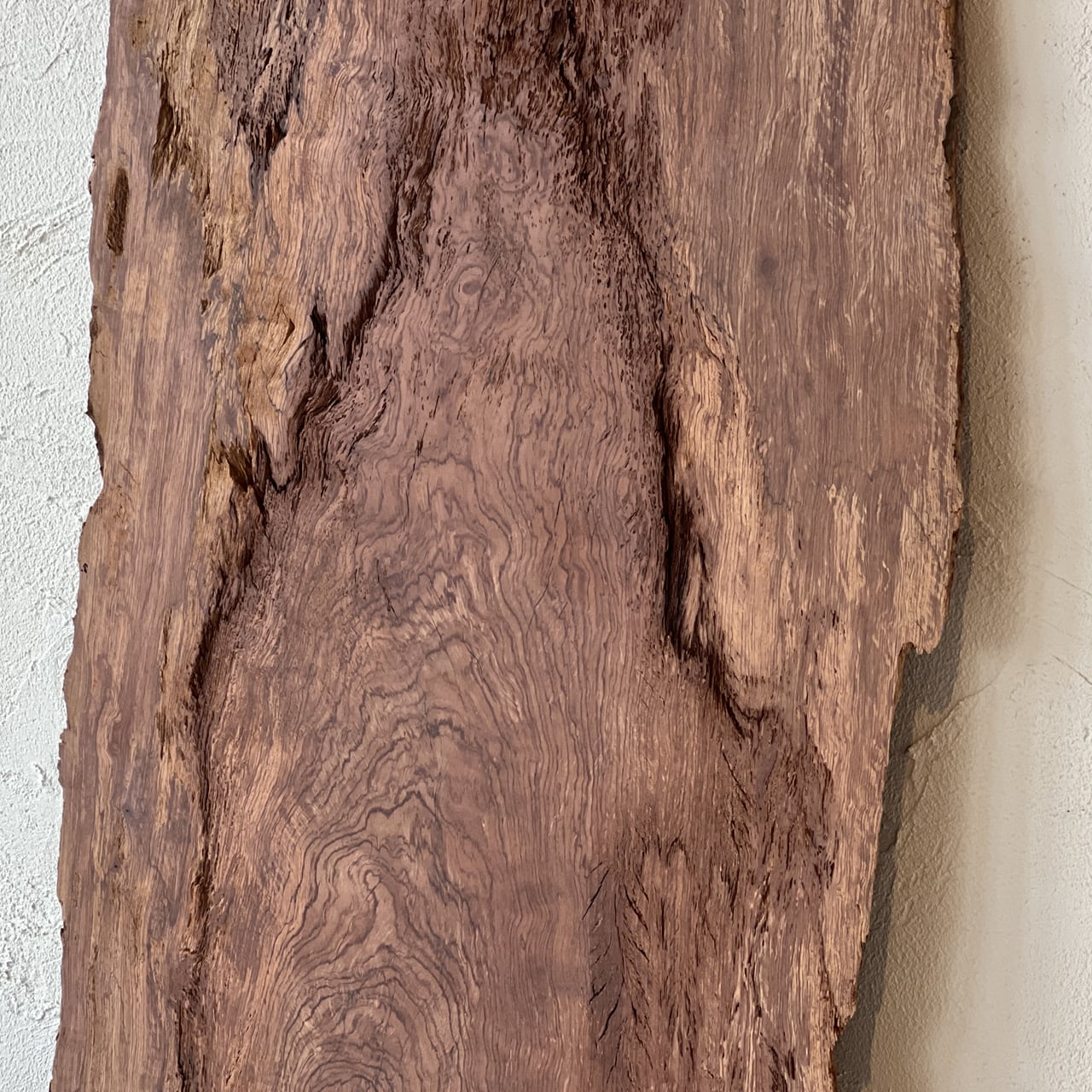 この板は、濃淡のはっきりした木目が特徴的で、全体に力強い流れを感じさせる模様が広がっています。細かく密なラインと、太く波打つような縞模様が混在しており、材の成長過程を視覚的に伝えています。色調は淡い黄褐色から深い焦茶まで幅があり、自然なグラデーションが表面に奥行きを与えています。縁は加工されておらず、原木の形状をそのまま残したような不規則な輪郭が、素材の素朴さと力強さを際立たせています。