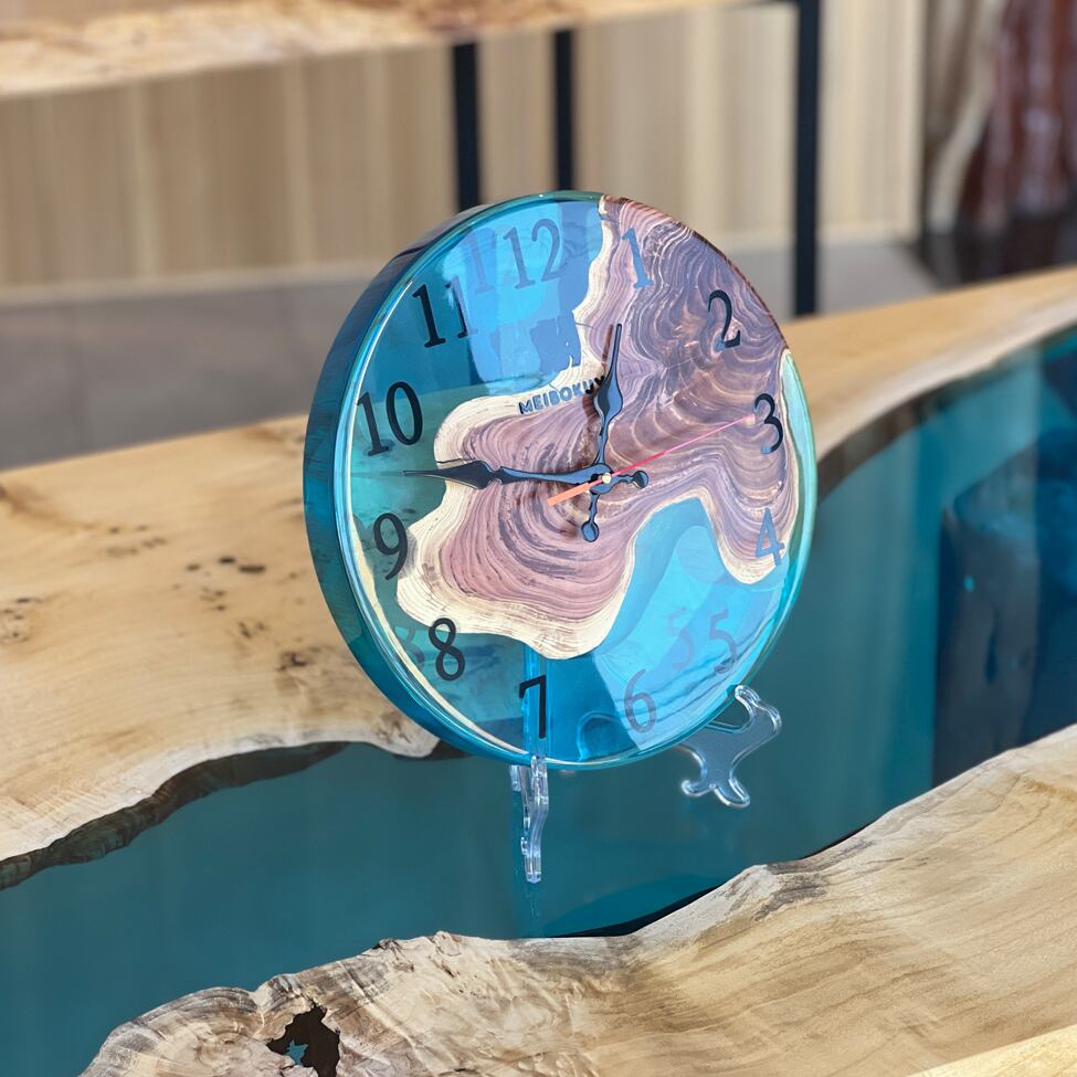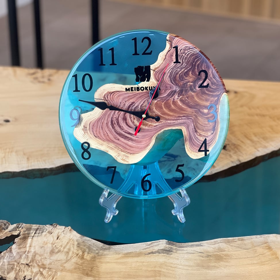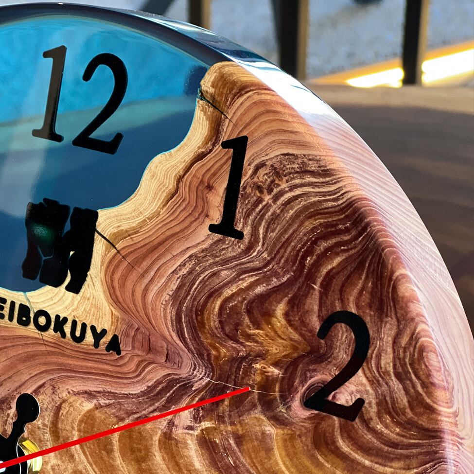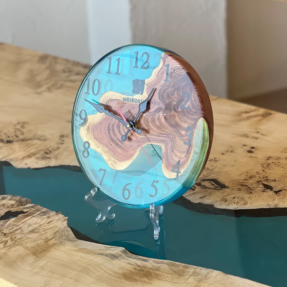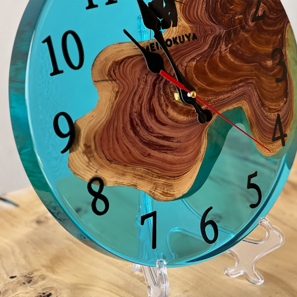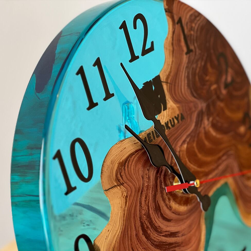 貝塚息吹の美しい年輪と、透明感あふれるブルーレジンを組み合わせた、一点物のレジンクロックです。