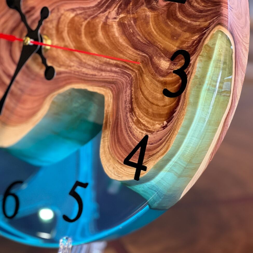 天然木ならではのうねる木目と、澄んだ水面のようなレジンが調和し、見る角度によってさまざまな表情を楽しめます。